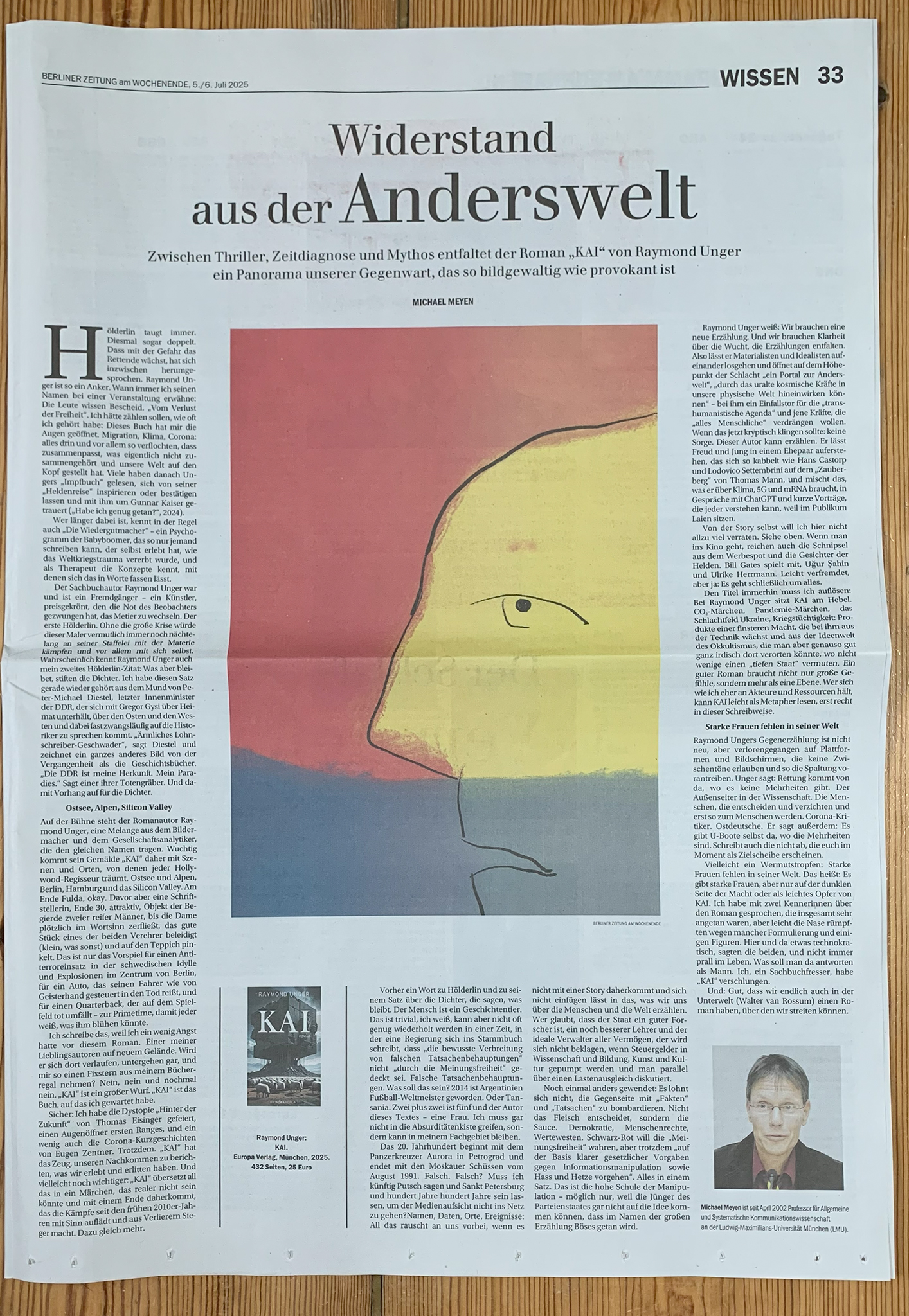 „KAI ist ein großer Wurf. KAI ist das Buch, auf das ich gewartet habe. […] Dieser Autor kann erzählen. Er lässt Freud und Jung in einem Ehepaar auferstehen, das sich so kappelt wie Hans Castorp und Lodovico Settembrini auf dem Zauberberg von Thomas Mann, und mischt das, was er über Klima, 5G und mRNA braucht, in Gespräche mit ChatGPT und kurze Vorträge, die jeder verstehen kann, weil im Publikum Laien sitzen.“